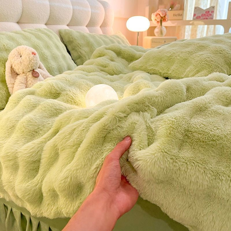 - Higher Density: Crafted from high-density 750GSM faux rabbit fur, this duvet cover set offers an extra-thick and plush feel for superior softness and warmth. The luxurious material, lined with 230GSM milk velvet, is skin-friendly and ideal for bare sleeping. Designed to resist shedding, it provides a gentle, irritation-free experience for ultimate comfort
