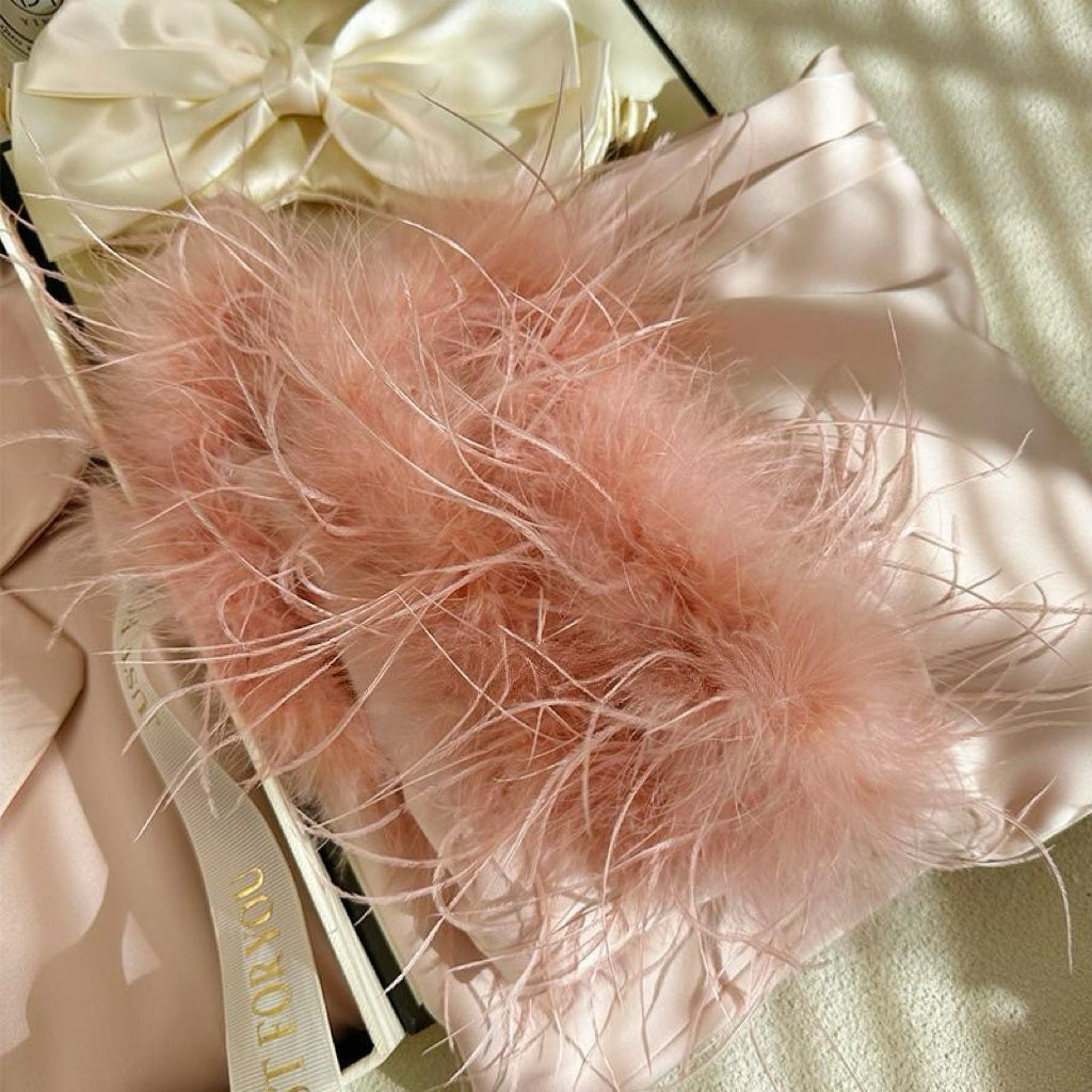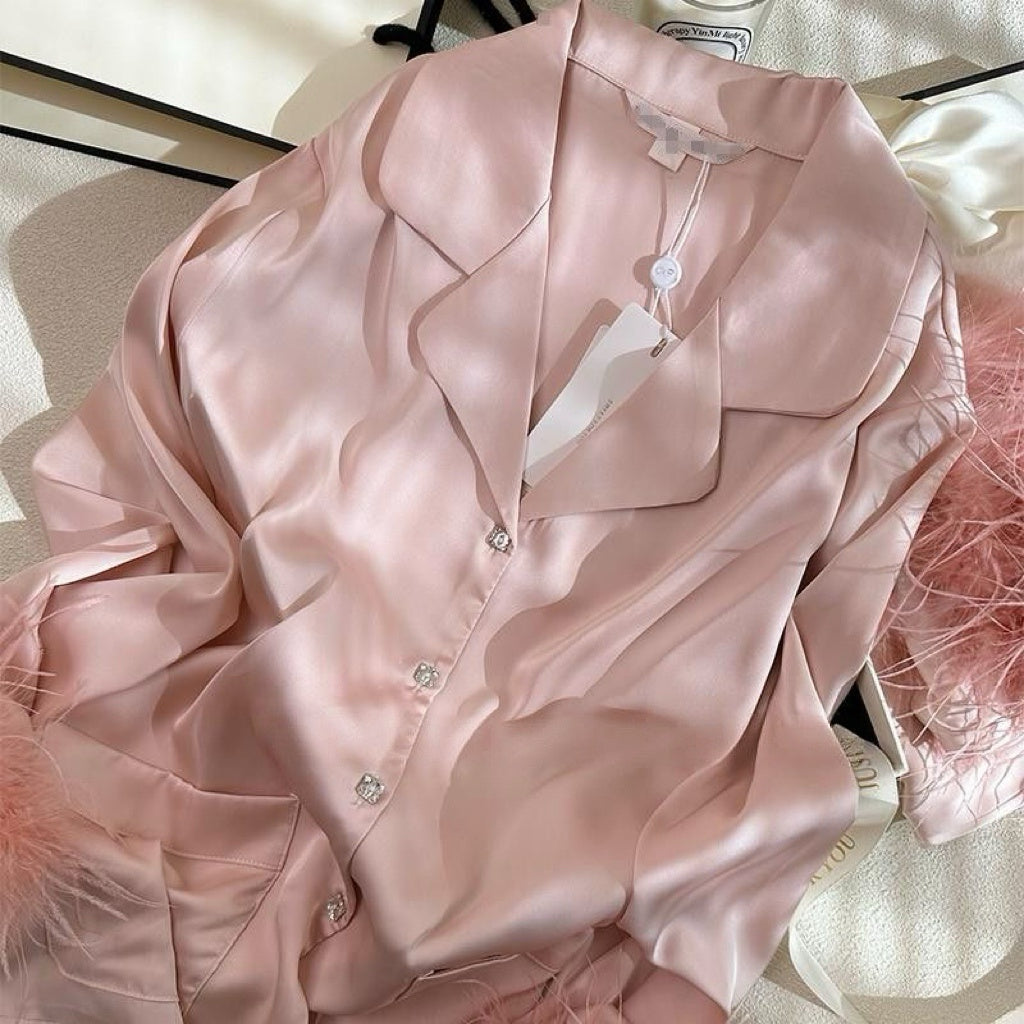 Women's 2 Piece Satin Sleepwear Fuzzy Trim Long Sleeve Button Down Shirt and Pants Pajama Set